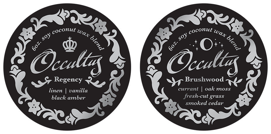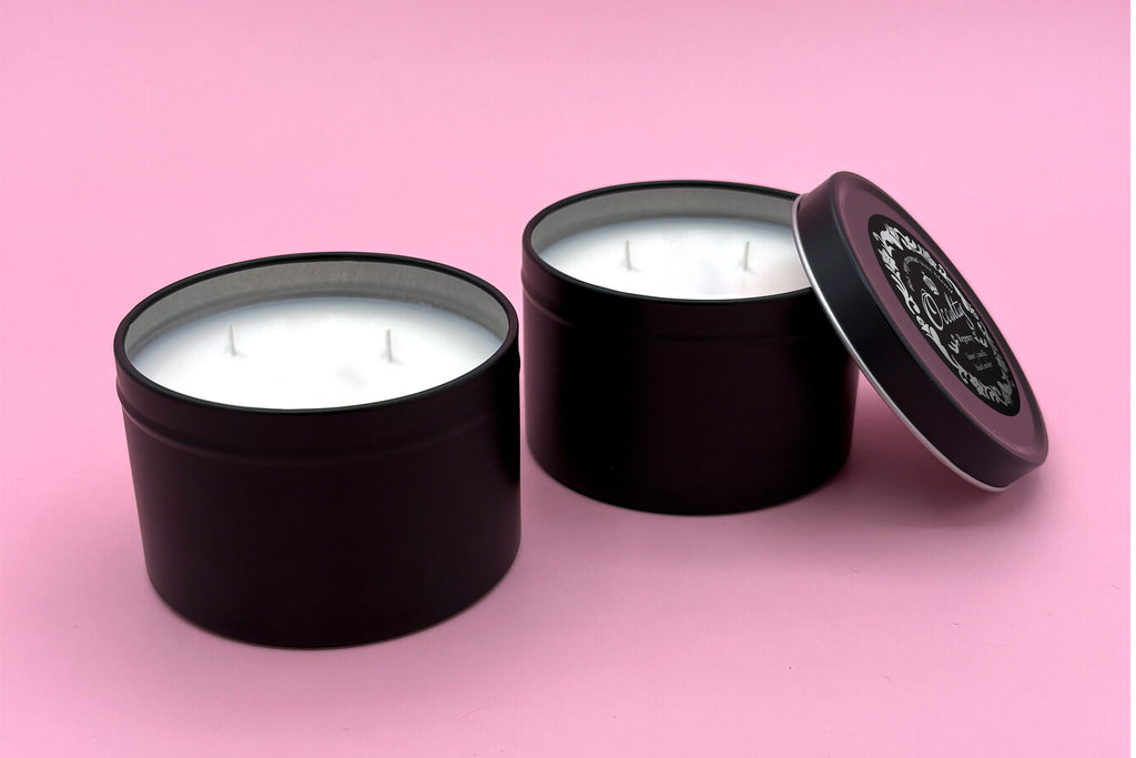 6oz soy-coconut wax candles in black tins. Comes in two scents:
