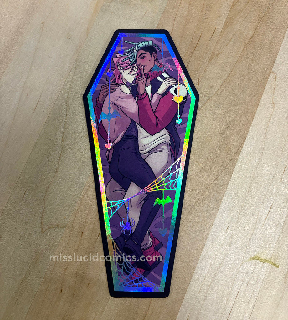 2x6 inch bookmark shaped like a coffin, with holo foil on one side